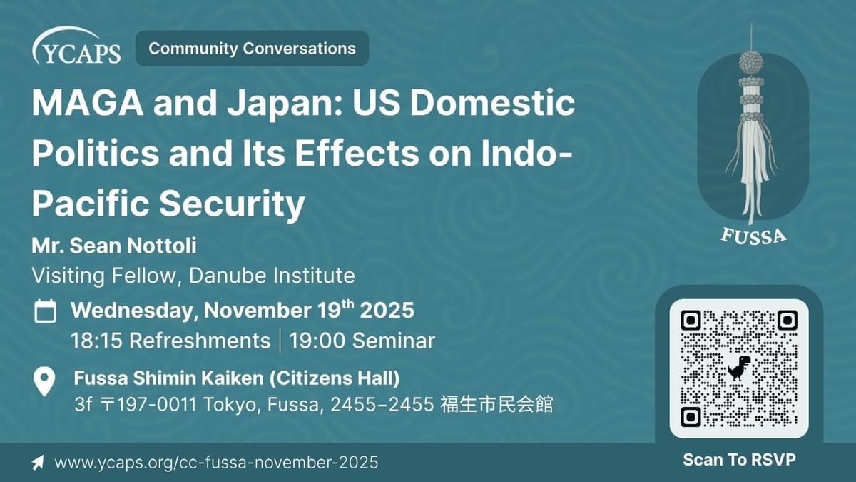 YCAPS is excited to announce our next event in Fussa. This event will feature Mr. Sean Nottoli, Visiting Fellow, Danube Institute who will be presenting "MAGA and Japan: US Domestic Politics and Its Effects on Indo-Pacific Security".