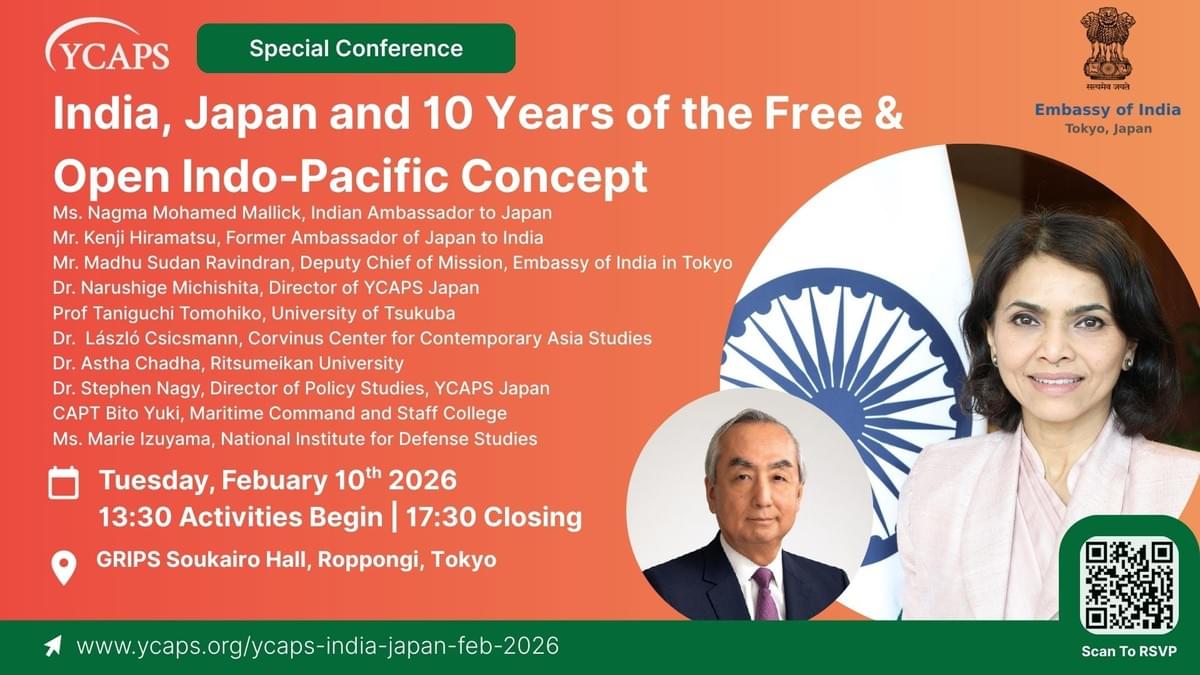 The Embassy of India in Tokyo and the Yokosuka Council on Asia-Pacific Studies (YCAPS) are pleased to co-host a special seminar titled “India, Japan, and 10 Years of the Free & Open Indo-Pacific Concept.”