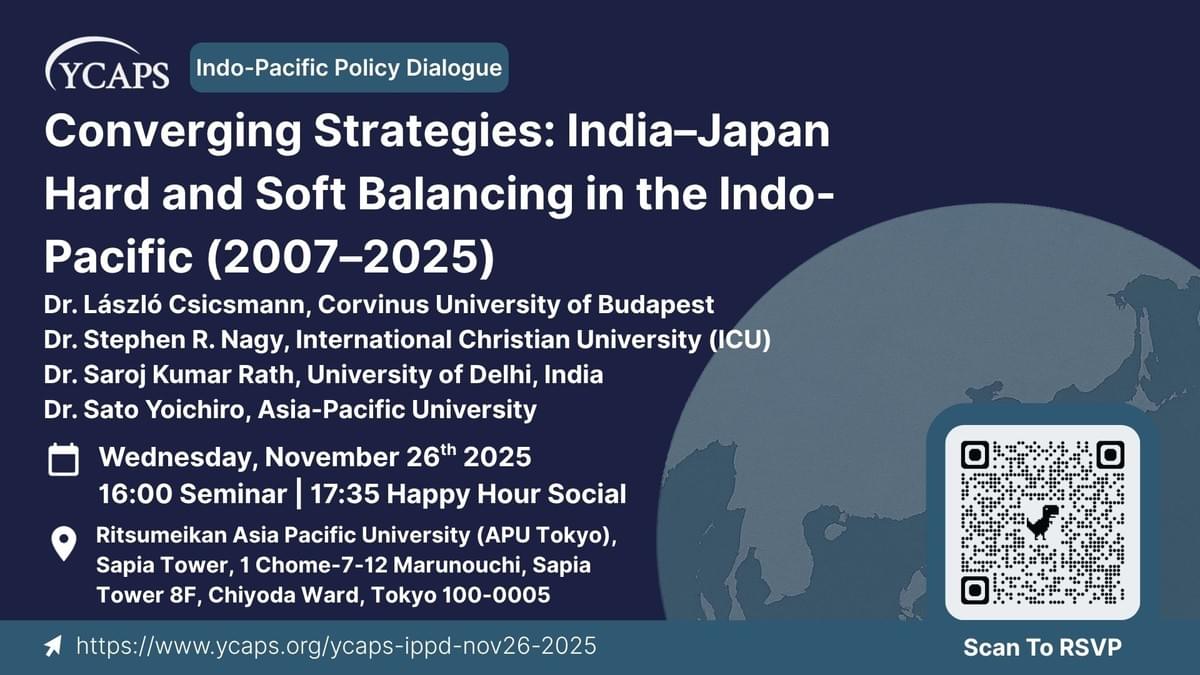 This hybrid seminar, part of the Indo-Pacific Policy Dialogue Series hosted by YCAPS, explores the evolution of India–Japan strategic cooperation from 2007 to 2025 through the dual lenses of hard and soft balancing. Stephen Nagy and László Csicsman will examine how both nations have used military and non-military tools to respond to China’s rise while managing complex relations with the United States. Drawing on power indices such as the Asia Power Index and Comprehensive National Power framework, their analysis highlights five key phases of cooperation—from Prime Minister Abe’s “Confluence of the Two Seas” speech to the present. The event argues that India and Japan’s approaches reflect complementary balancing strategies that go beyond mere counterbalancing, aiming instead to construct a multipolar Indo-Pacific characterized by “soft” or “quasi-multi-alignment.” Together, these efforts diffuse regional power away from Chinese centrality toward multiple poles—India, ASEAN, Japan–South Korea, and Australia–New Zealand—while maintaining the U.S. as a vital but non-hegemonic actor. Dr. Sato Yoichiro (Ritsumeikan APU) and Dr. Saroj Kumar Rath (University of Delhi) will provide critical feedback before taking questions and comments from the audience.